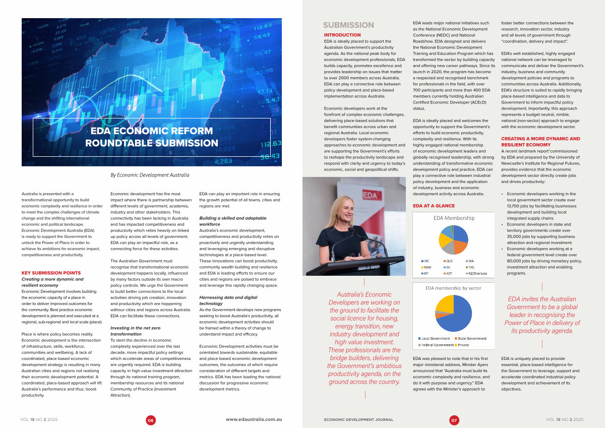 Australia is presented with a transformational opportunity to build economic complexity and resilience in order to meet the complex challenges of climate change and the shifting international economic and political landscape. Economic Development Australia( EDA) is ready to support the Government to unlock the Power of Place in order to achieve its ambitions for economic impact, competitiveness and productivity.