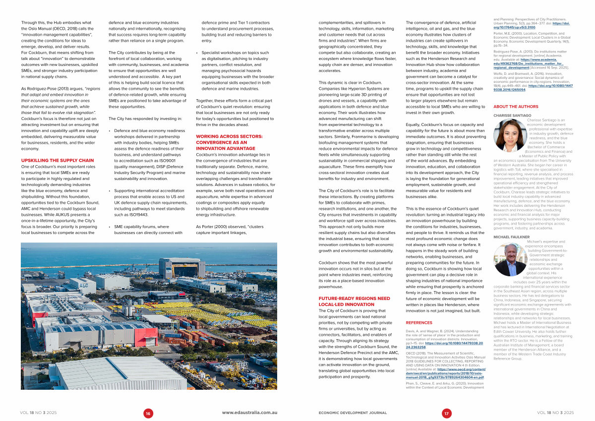 FUTURE-READY REGIONS NEED LOCAL-LED INNOVATION The City of Cockburn is proving that local governments can lead national priorities, not by competing with private firms or universities, but by acting as connectors, facilitators, and enablers of capacity. Through aligning its strategy with the strengths of Cockburn Sound, the Henderson Defence Precinct and the AMC, it is demonstrating how local governments can activate innovation on the ground, translating global opportunities into local participation and prosperity.