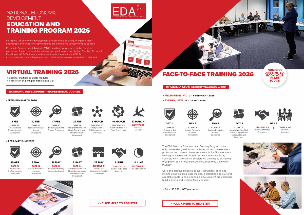 The EDA National Education and Training Program is the only course designed for Australian economic development professionals. Limited places are available for EDA members wishing to achieve certification at these intensive 5-day courses, which provide an accelerated pathway to achieving recognition as an Australian Certified Economic Developer( ACEcD).