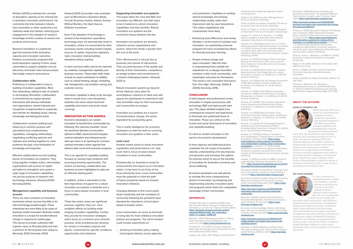 Pantano( 2025) scrutinises the concept of absorptive capacity as the missing link in Australia’ s innovation performance. He comments that links between industry and universities or other researchers are relatively weak and shallow, reducing joint engagement in the adoption of research knowledge and the creation of valued new products and services.