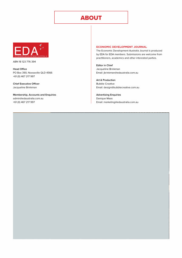 ECONOMIC DEVELOPMENT JOURNAL The Economic Development Australia Journal is produced by EDA for EDA members. Submissions are welcome from practitioners, academics and other interested parties.