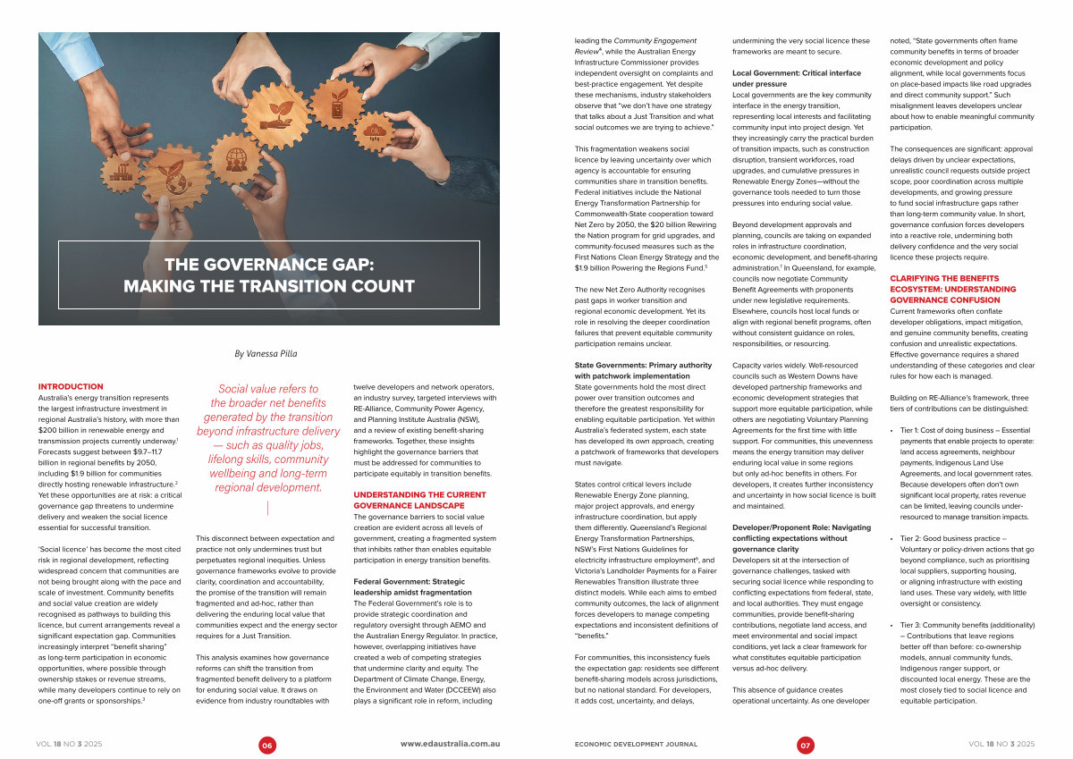INTRODUCTION Australia’ s energy transition represents the largest infrastructure investment in regional Australia’ s history, with more than $ 200 billion in renewable energy and transmission projects currently underway. 1 Forecasts suggest between $ 9.7 – 11.7 billion in regional benefits by 2050, including $ 1.9 billion for communities directly hosting renewable infrastructure. 2 Yet these opportunities are at risk: a critical governance gap threatens to undermine delivery and weaken the social licence essential for successful transition.