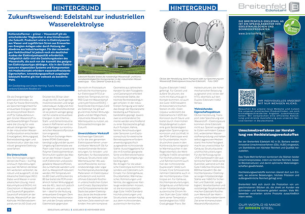 Duplex Edelstahl 1.4462 gefertigt. Für Gestell und äußere Strukturen, die nicht mit Kaliumlauge in Kontakt kommen, ist auch die Güte 1.4301 bewährt. An besonders kritischen Stellen im AEL-Elektrolyseur widersteht die Edelstahlsorte 1.4539 der Korrosion durch Säure und bietet durch ihren hohen Molybdängehalt zudem eine gute Beständigkeit gegenüber Spannungsrisskorrosion und Lochfraß. In der PEM-Elektrolyse wird für Druckbehälter, Hochdruckrohre sowie in den Kühlkreisläufen eingesetzte Wärmetauscher in der Regel ebenfalls die Werkstoffgüte 1.4404 verwendet. Für Hochdruckleitungen und Rahmen kommt auch hier der nichtrostende Duplexstahl 1.4462 zum Einsatz. Eine Schlüsselrolle nehmen Edelstähle auch in der Hochtemperatur-Elektrolyse ein. Für Gehäuse, Hochtemperaturleitungen, Zellgehäuse und Reformer ist der hitzebeständige austenitische Chrom-Nickel-Stahl der Güte 1.4845 dank seiner Temperaturbeständigkeit bis 1.050 Grad gängige Praxis. Bei