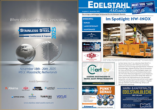 Auf den Seiten 4 bis 7: Zur „ Stainless Steel World“ in Maastricht präsentiert HW-INOX sein erweitertes Sortiment und neue Fertigungsmöglichkeiten. Moderne Schneidanlagen, digitale Prozesse und ein konsequenter Fokus auf Effizienz und Nachhaltigkeit zeigen, wie das Unternehmen Technik und Verlässlichkeit verbindet. Mit hoher Materialverfügbarkeit, kurzen Reaktionszeiten und präzisen Zuschnitten bleibt HW-INOX ein fester Partner der Edelstahlbranche. Das Spotlight beleuchtet, wie das Familienunternehmen seine Lagerund Fertigungskapazitäten gezielt ausbaut, in Digitalisierung investiert und mit Erfahrung, Tempo und Verlässlichkeit überzeugt.