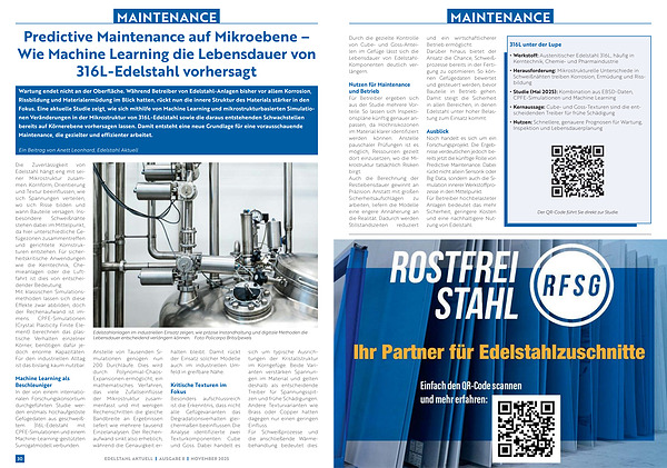 Ausblick Noch handelt es sich um ein Forschungsprojekt. Die Ergebnisse verdeutlichen jedoch bereits jetzt die künftige Rolle von Predictive Maintenance. Dabei rückt nicht allein Sensorik oder Big Data, sondern auch die Simulation innerer Werkstoffprozesse in den Mittelpunkt. Für Betreiber hochbelasteter Anlagen bedeutet das mehr Sicherheit, geringere Kosten und eine nachhaltigere Nutzung von Edelstahl.