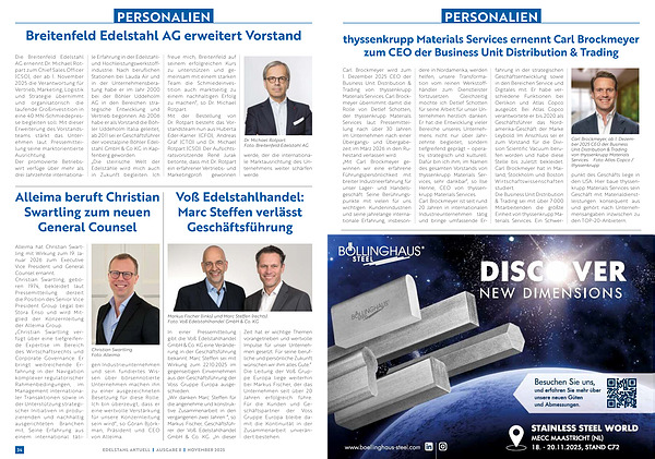 Carl Brockmeyer wird zum 1. Dezember 2025 CEO der Business Unit Distribution & Trading von thyssenkrupp Materials Services. Carl Brockmeyer übernimmt damit die Rolle von Detlef Schotten, der thyssenkrupp Materials Services laut Pressemitteilung nach über 30 Jahren im Unternehmen nach einer Übergangs- und Übergabezeit im März 2026 in den Ruhestand verlassen wird. „ Mit Carl Brockmeyer gewinnen wir eine erfahrene Führungspersönlichkeit mit breiter Industrieerfahrung für unser Lager- und Handelsgeschäft. Seine Berührungspunkte mit vielen für uns wichtigen Kundenindustrien und seine jahrelange internationale Erfahrung, insbesondere |