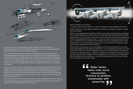 only be travelling in one direction. “It would have less lateral acceleration—which is what tends to make people feel motion sick. Unlike an airplane, it is not subject to turbulence, so there are no sudden movements. It would feel super smooth.” Before you go thinking that the Hyperloop will be the mode of transport that replaces everything else it is only designed to link cities less than 1000 miles apart that have high amounts of traffic between them as is the case with L.A and San Francisco. Any further and it becomes cheaper and easier to simply fly between the destinations. In terms of overall costs Musk estimates that the loop for people-only pods could be built for $6 billion and one carrying people and cars would cost $10 billion. It’s an expensive price tag but comes in at a tenth the cost of California’s highspeed railway and would travel four times as fast. While the plans certainly open a door of possibilities for the future of transport for now all that exists of the Hyperloop are drawings and calculations. “I’m just putting this out there as an open source design. There are sure to be suggestions out there for making this better, correcting any mistakes, and refining the design,” says Musk. The billionaire may have the funds to put this plan into motion but his roles in charge of Tesla and SpaceX mean he cannot commit to the project full-time. Whether someone else steps in and makes the Hyperloop a reality is anyone’s guess. For now though it’s just a bunch of hype.