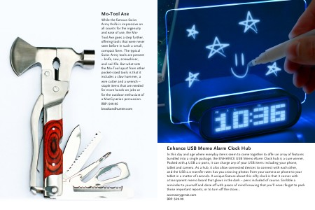 While the famous Swiss Army Knife is impressive on all counts for the ingenuity and ease of use, the MoTool Axe goes a step further, offering tools that were never seen before in such a small, compact form. The typical Swiss Army tools are present – knife, saw, screwdriver, and nail file. But what sets the Mo-Tool apart from other pocket-sized tools is that it includes a claw hammer, a wire cutter and a wrench – staple items that are needed for more hands-on jobs or for the outdoor enthusiast of a MacGyverian persuasion. RRP: $49.95 brookandhunter.com