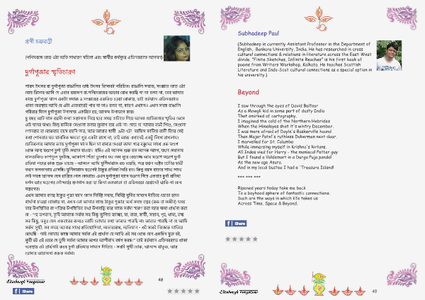 শারদ উৎসব বা দুগ�াপূজা বাঙািলর ��� উৎসব িহেসেবই পিরিচত । বাঙািল সমাজ, সং�াের �বেড় ওঠা �মেয় িহেসেব আিম �য এবার ব�েদশ বা. পি�মবে�র অভাব �বাধ করিছ না তা বলব না, তেব আমার কােছ দুগ�াপূজা মােন একটা সমাজ ও সং�ােরর একি�ত হওয়া �বাঝায়, তাই বত� মােন এিডনবরােত থাকা অব�ায় আিম �য এটা এেকবােরই পাব না তাও বলব না, কারণ এখােনও এখন সম� বাঙািল পিরবার িমেল দুগ�াপূজা উপলে� একি�ত হয়, আন� উপেভাগ কের । দু বছর আট মাস বয়সী কন�া স�ানেক িনেয় ঘের সময় কাটােত িগেয় অেনক �ছাটেবলার �ৃিতও �ভেস ওেঠ মেনর মেধ� । িক� কাউেক �স�েলা বলার সুেযাগ হেয় ওেঠ না । �মেয় �য আমার বড়ই িশ�, �স�েলা �শানবার বা �বাঝবার বয়স হয়িন তার, আর আমার �ামী ৯টা-৭টা অিফস কা�েয় বাড়ী িফের �সই কথা �শানবার মত মানিসক �মতা খ� ব একটা রােখ না, তাই আজ এখােনই একট� িলেখ রাখলাম । �ছাটেবলায় আমার কােছ দুগ�াপূজা মােন িছল মা বাবার �দওয়া জামা পের ব�� েদর সােথ এক ম�প �থেক অন� ম�েপ দুগ�া মূ�ত� �দখেত যাওয়া । যিদও এই আন� �র� হত অেনক আেগ, যখন �দখতাম ঘাসজিমেত কাশফ� ল ফ� েটেছ, আকােশ �প�জা ত� েলার মত �মঘ ঘ� ের �বড়াে� আর ম�েপ ম�েপ দুগ�া �িতমা গড়ার কাজ �র� হেয়েছ- আসেল আিম মু�শ�দাবােদ বড় হেয়িছ, পের যখন অ�ম ��িণর ছা�ী তখন কলকাতায় এেসিছ । মু�শ�দাবােদ ম�েপই ঠাক� র �িতমা �তির হত । িক� বয়স বাড়ার সােথ সােথ �সই সম� আন� �যন হািরেয় �গল �কাথায় । এখন দুগ�াপূজা মােন ম�েপ িগেয় একবার দুগ�া �িতমা দশ�ন আর ম�েপর �সৗ�েয�র �ণগান করা যা িকনা কলকাতা বা এিডনবড়া �যখােনই থািক না �কন স�বপর । এখন আমার কােছ ঠাক� র পূজা মােন �কান িন�দ�� সমেয়, িন�দ�� মূ�ত�র সামেন দঁ ািড়েয় �জাড়া হােত �াথ�না চাওয়া �বাঝায় না, এখন �তা আমার কােছ ঠাক� র পূজার অথ� সম� ব�র( জড় বা সজীব) মেধ� তার উপি�িতর বা শি�র উপি�িতর কথা উপলি� কের তােক সব�দা �রণ করা আর �মা �াথ�না করা �য-“ �হ ভগবান, ত� িম আমােক সব�দা সব িকছ� জুিগেয় যাে�া, মা, বাবা, �ামী, স�ান, গৃহ, খাদ�, বT সব িকছ�, তব� ও �যন একবােরর জন�ও আিম �তামার কথা ভাবেত পারিছ না । ভাবেত পারিছ না �য আিম সব�দা সুখী, সব সময় অেন�র সােথ �িতেযািগতা, অভাবেবাধ, অিভমান- এই সেবই িনেজেক মািতেয় �রেখিছ- তাই �তামার কােছ আমার সব�দা এই �াথ�না �য আিম এই সব �থেক �যন একিদন মু� হই, সুখী হই এই �ভেব �য ত� িম সব�দা আমার অপর আশীব�াদ বষ�ণ করছ ।” তাই বত� মােন এিডনবরােত থাকা অব�ায় এই �াথ�নাই করব দুগ�া �িতমার সামেন দঁ ািড়েয়- সবাই সুখী �হাক, আনে� থাক� ক, আর �তামার আরাধনা কর�ক সব�দা ।