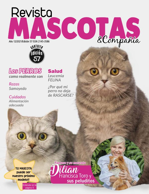 Revista Año 12 / 2021 / Edición 57 ISSN 2145-3586 Edición 57 GRATUITA Salud Salud Leucemia FELINA ¿ Por qué mi perro no deja de RASCARSE ? Los Los PERROS PERROS como realmente son Cuidados Alimentación adecuada Dilian Famoso y su mascota Famoso y su mascota & Compañía & Compañía Razas Samoyedo Francisca Toro y sus peluditos TU MASCOTA puede ser nuestro próximo modelo !! Entérate en la página 5