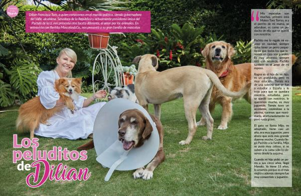 Mascota Dilian Francisca Toro , a quien conocemos en el mundo político , siendo gobernadora del Valle , alcaldesa , Senadora de la República y actualmente presidenta única del Partido de la U , nos presenta otra faceta diferente , el amor por los animales . En entrevista con Revista Mascotas & Co ., nos presentó a su gran familia de mascotas
