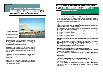 Hemos actualizado al 1 de febrero de 2014 nuestra base de datos en lo referente a Unidades de Verificación y Laboratorios acreditados ante EMA en los diferentes rubros que se manejan, así en las siguientes secciones presentamos los datos correspondientes a: