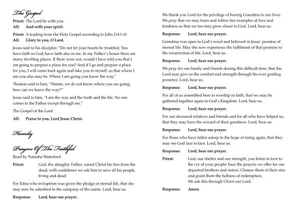 Grandma was open to God ’ s word and believed in Jesus ’ promise of eternal life . May she now experience the fulfilment of that promise to the resurrection of life . Lord , hear us .