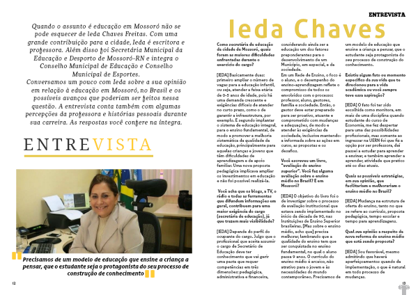 [IEDA] O objetivo do livro foi o de investigar sobre o processo de avaliação institucional que estava sendo implementado no início da década de 90, nas Instituições de Ensino Superior brasileiras. [Mas sobre o ensino médio, acho que] precisa melhorar, lembrando que a qualidade do ensino tem que ser conquistada no ensino fundamental, no qual o aluno passa 9 anos. O currículo do ensino médio é arcaico, não atrativo para o jovem e às necessidades do mundo contemporâneo. Precisamos de um modelo de educação que ensine a criança a pensar, que o estudante seja protagonista do seu processo de construção do conhecimento.