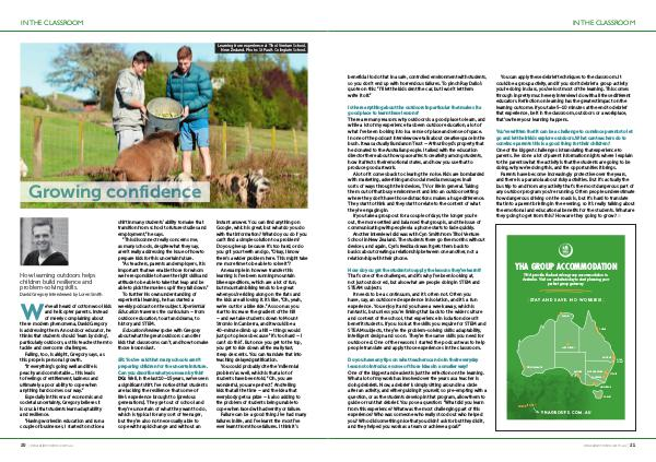 ER: You’ ve said that many schools aren’ t preparing children for the uncertain future. Can you describe what you mean by this? DG: Well, in the last 10 – 15 years, we’ ve seen a significant shift. I’ ve noticed that students are lacking the resilience that some of life’ s experience brought to [ previous generations ]. They get out of school and they’ re uncertain of what they want to do, which is typical for any sort of teenager, but they’ re also not necessarily able to cope with rapid change and without an instant answer. You can find anything on Google, which is great, but what do you do with that information? What do you do if you can’ t find a simple solution to a problem? Do you give up because it’ s too hard, or do you grit your teeth and go,“ Okay, I know there’ s a wider problem here. This might take me more time to be able to solve it”?