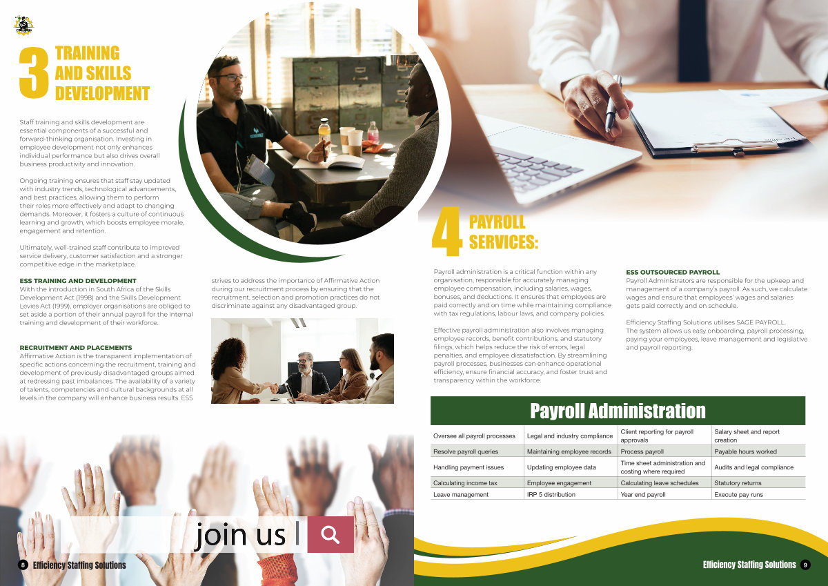 RECRUITMENT AND PLACEMENTS Affirmative Action is the transparent implementation of specific actions concerning the recruitment, training and development of previously disadvantaged groups aimed at redressing past imbalances. The availability of a variety of talents, competencies and cultural backgrounds at all levels in the company will enhance business results. ESS