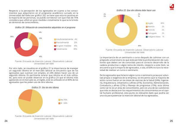 Por otro lado , se visualiza en el gráfico 21 la importancia de manejar un segundo idioma en el mercado laboral se encuentra que de los egresados que cuentan con empleo , el 24 % deben hacer uso de un segundo idioma . Es pertinente aclarar que idioma es el más utilizado , para esto se puede observar en la gráfica 23 que el idioma más apetecido en el mercado es , el inglés , este es utilizado en el 85 % de los egresados que les piden uso de otro idioma .
