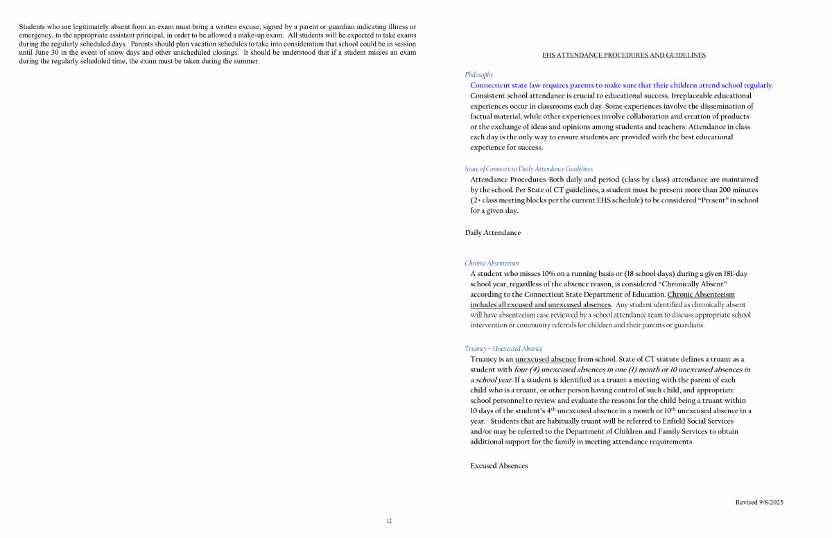 Students who are legitimately absent from an exam must bring a written excuse, signed by a parent or guardian indicating illness or emergency, to the appropriate assistant principal, in order to be allowed a make-up exam. All students will be expected to take exams during the regularly scheduled days. Parents should plan vacation schedules to take into consideration that school could be in session until June 30 in the event of snow days and other unscheduled closings. It should be understood that if a student misses an exam during the regularly scheduled time, the exam must be taken during the summer.