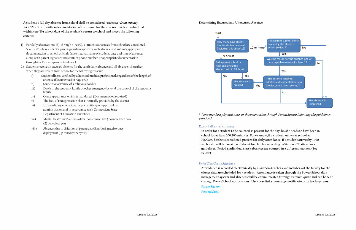 1) For daily absences one( 1) through nine( 9), a student’ s absences from school are considered“ excused” when student’ s parent / guardian approves such absence and submits appropriate documentation to school officials( note that has name of student, date and time of absence, along with parent signature and contact phone number, or appropriate documentation through the ParentSquare attendance).
