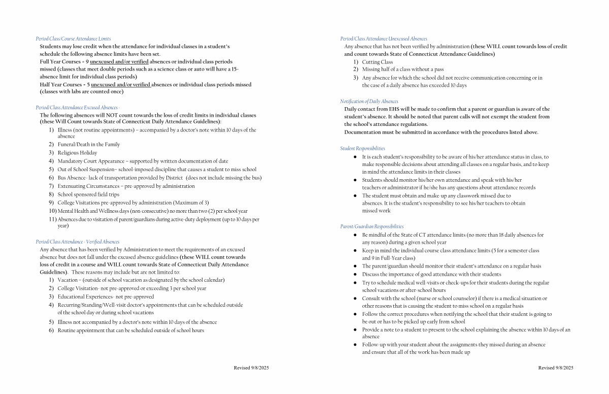 The following absences will NOT count towards the loss of credit limits in individual classes( these Will Count towards State of Connecticut Daily Attendance Guidelines):