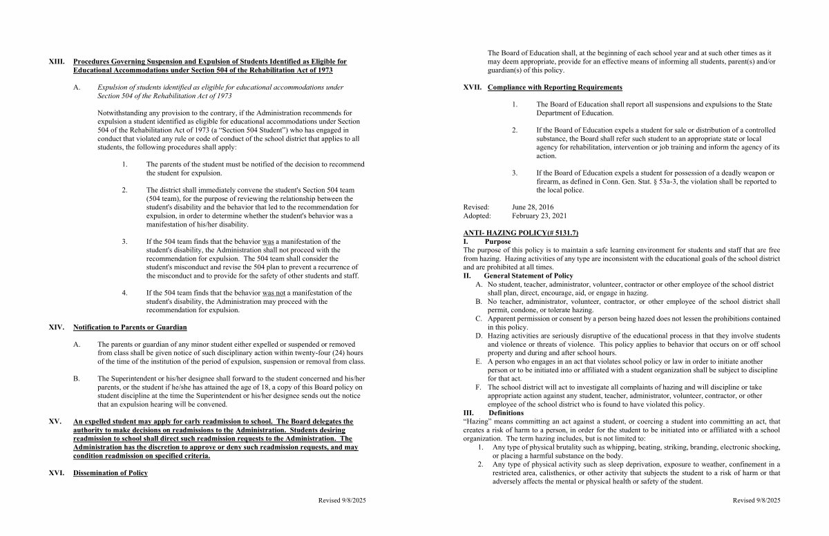 ANTI- HAZING POLICY(# 5131.7) I. Purpose The purpose of this policy is to maintain a safe learning environment for students and staff that are free from hazing. Hazing activities of any type are inconsistent with the educational goals of the school district and are prohibited at all times. II. General Statement of Policy