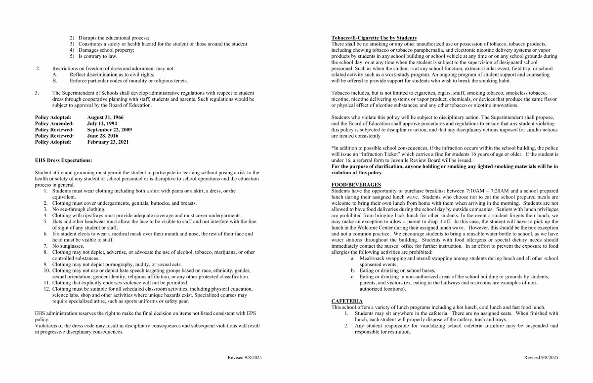 Tobacco / E-Cigarette Use by Students There shall be no smoking or any other unauthorized use or possession of tobacco, tobacco products, including chewing tobacco or tobacco paraphernalia, and electronic nicotine delivery systems or vapor products by students in any school building or school vehicle at any time or on any school grounds during the school day, or at any time when the student is subject to the supervision of designated school personnel. Such as when the student is at any school function, extracurricular event, field trip, or school related activity such as a work-study program. An ongoing program of student support and counseling will be offered to provide support for students who wish to break the smoking habit.