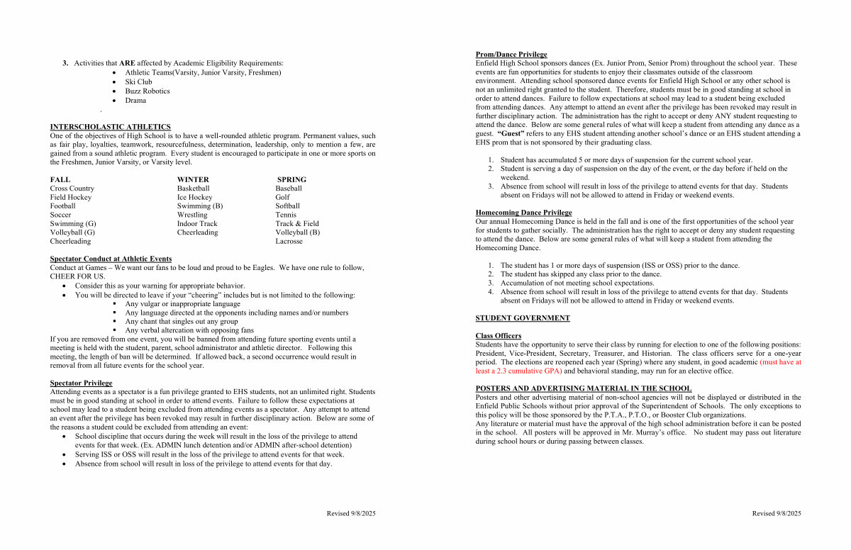 Prom / Dance Privilege Enfield High School sponsors dances( Ex. Junior Prom, Senior Prom) throughout the school year. These events are fun opportunities for students to enjoy their classmates outside of the classroom environment. Attending school sponsored dance events for Enfield High School or any other school is not an unlimited right granted to the student. Therefore, students must be in good standing at school in order to attend dances. Failure to follow expectations at school may lead to a student being excluded from attending dances. Any attempt to attend an event after the privilege has been revoked may result in further disciplinary action. The administration has the right to accept or deny ANY student requesting to attend the dance. Below are some general rules of what will keep a student from attending any dance as a guest.“ Guest” refers to any EHS student attending another school’ s dance or an EHS student attending a EHS prom that is not sponsored by their graduating class.