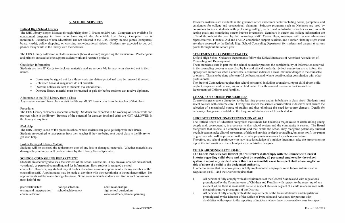STATEMENT OF CONFIDENTIALITY Enfield High School Guidance Departments follow the Ethical Standards of American Association of Counseling and Development. These standards state in part that the school counselor protects the confidentiality of information received in the counseling process as specified by law and ethical standards. School counselors are to inform the appropriate authorities when a counselee’ s condition indicates a clear imminent danger to the counselee or others. This is to be done after careful deliberation and, where possible, after consultation with other professionals. The State of Connecticut requires that school personnel, including counselors, report child abuse, child neglect, suspected child abuse, and / or a child under 13 with venereal disease to the Connecticut Department of Children and Families.