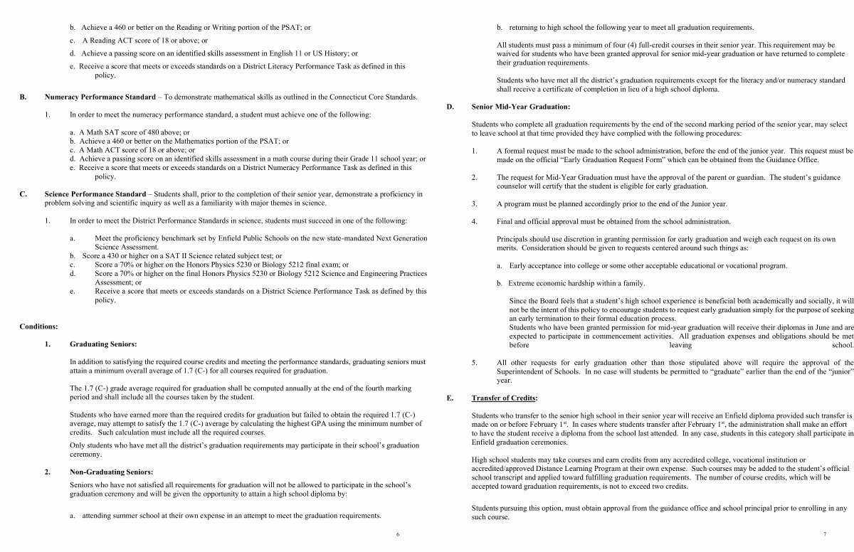 Students who transfer to the senior high school in their senior year will receive an Enfield diploma provided such transfer is made on or before February 1 st. In cases where students transfer after February 1 st, the administration shall make an effort to have the student receive a diploma from the school last attended. In any case, students in this category shall participate in Enfield graduation ceremonies.