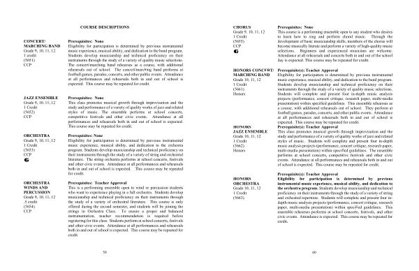 Prerequisite ( s ): Teacher Approval Eligibility for participation is determined by previous instrumental music experience , musical ability , and dedication to the band program . Students develop musicianship and technical proficiency on their instruments through the study of a variety of quality music selections . Students will complete and present four in-depth music analysis projects ( performance , concert critique , research paper , multi-media presentation ) within specified guidelines . This ensemble rehearses as a course , with additional rehearsals out of school . They perform at football games , parades , concerts , and other public events . Attendance at all performances and rehearsals both in and out of school is expected . This course may be repeated for credit . Prerequisite ( s ): Teacher Approval This class promotes musical growth through improvisation and the study and performance of a variety of quality works of jazz and related styles of music . Students will complete and present four in-depth music analysis projects ( performance , concert critique , research paper , multi-media presentation ) within specified guidelines . The ensemble performs at school concerts , competitive festivals and other civic events . Attendance at all performances and rehearsals both in and out of school is expected . This course may be repeated for credit .