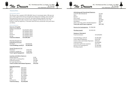 Advertising and Promotional Expenses Local TV Advertisement Flyer Banner Direct mail Printed Advertisement Workshop Other: Part-time job for distributing flyer Total Adv and Promo expenses $1,500 $285 $500 $400 $20,000 $5,000 $70 $27,755 Reserve for Contingencies $1,500,000 Working Capital $3,549,235 Summary Statement Total Investment $15,000,000 Total Buildings and R/E Total Capital Equipment Total Location and Admin Expenses Total Inventory Total Adv and Promo expenses Reserve for Contingencies Working Capital $5,000,000 $244,390 $35,620 $4,648,000 $27,755 $1,500,000 $3,544,235