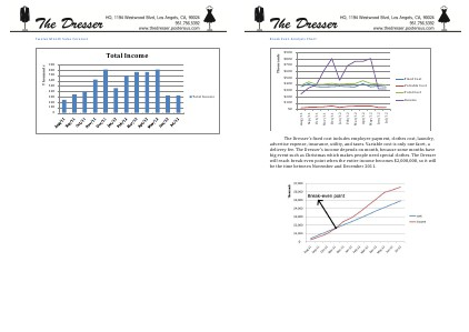 Thousands Break Even Analysis Chart $900 $800 $700 $600 $500 Fixed Cost $400 Variable Cost $300 Total Cost $200 Income $100 Jul/12 Jun/12 May/12 Apr/12 Mar/12 Feb/12 Jan/12 Dec/11 Nov/11 Oct/11 Sep/11 Aug/11 $0 The Dresser’s fixed cost includes employee payment, clothes cost, laundry, advertise expense, insurance, utility, and taxes. Variable cost is only one facet, a delivery fee. The Dresser’s income depends on month, because some months have big event such as Christmas which makes people need special clothes. The Dresser will reach break-even point when the entire income becomes $2,000,000, so it will be the time between November and December 2011.