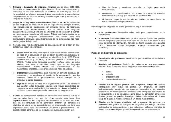 1. Primera- Lenguaje de máquina: Empieza en los años 1940-1950. Consistía en sucesiones de dígitos binarios. Todas las instrucciones y mandatos se escribían valiéndose de cadenas de estos dígitos. Aún en la actualidad, es el único lenguaje interno que entiende la computadora; los programas se escriben en lenguajes de mayor nivel y se traducen a lenguaje de máquina.