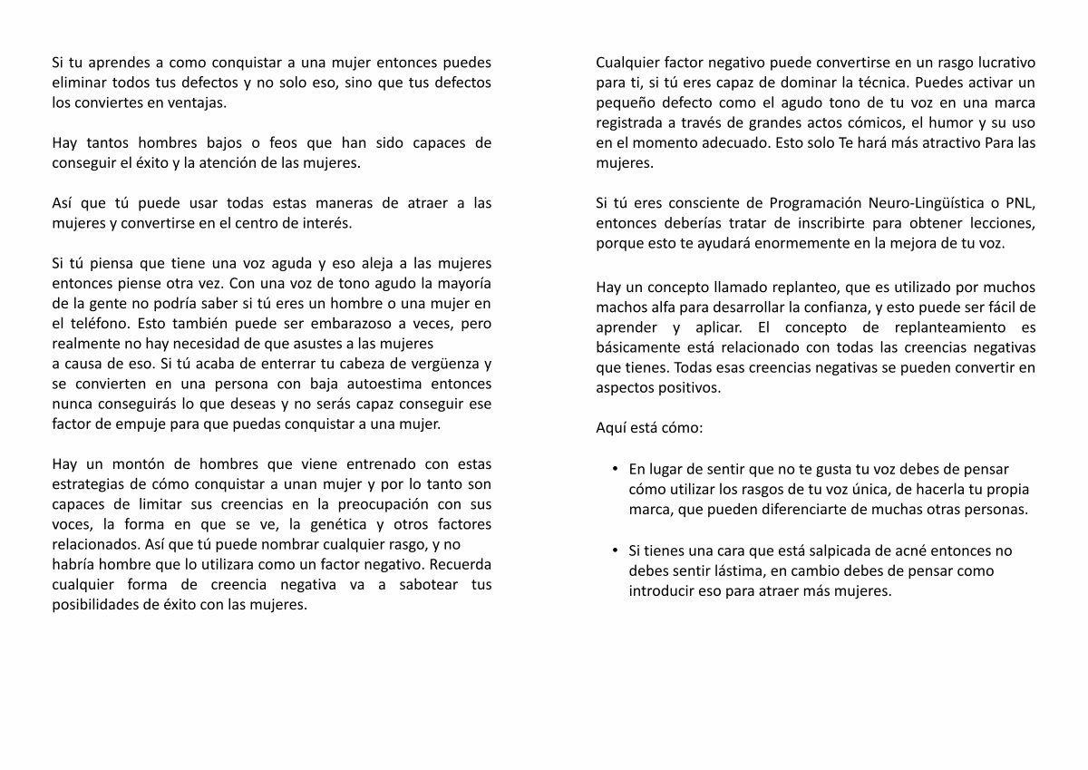 Cualquier factor negativo puede convertirse en un rasgo lucrativo para ti, si tú eres capaz de dominar la técnica. Puedes activar un pequeño defecto como el agudo tono de tu voz en una marca registrada a través de grandes actos cómicos, el humor y su uso en el momento adecuado. Esto solo Te hará más atractivo Para las mujeres.
