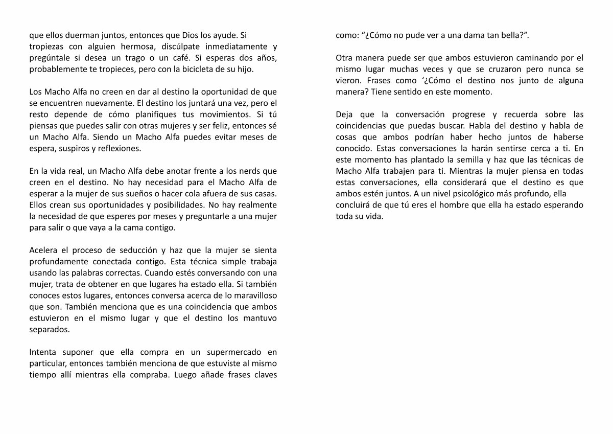 Deja que la conversación progrese y recuerda sobre las coincidencias que puedas buscar. Habla del destino y habla de cosas que ambos podrían haber hecho juntos de haberse conocido. Estas conversaciones la harán sentirse cerca a ti. En este momento has plantado la semilla y haz que las técnicas de Macho Alfa trabajen para ti. Mientras la mujer piensa en todas estas conversaciones, ella considerará que el destino es que ambos estén juntos. A un nivel psicológico más profundo, ella concluirá de que tú eres el hombre que ella ha estado esperando toda su vida.