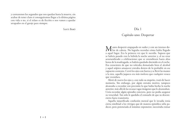 M auro despertó empapado en sudor y con un intenso dolor de cabeza . No lograba recordar cómo había llegado a aquel lugar . Era la primera vez que le sucedía . Supuso que se habría pasado con la bebida la noche anterior y , al no estar acostumbrado a celebraciones que se extendiesen hasta altas horas de la madrugada , se habría quedado dormido en el coche . Era consciente de que no toleraba demasiado bien el alcohol y aquel atípico amanecer entraba dentro de lo probable en ese supuesto contexto . Cerró los ojos con fuerza y se llevó las manos a la sien , aquella jaqueca era más molesta que cualquier resaca que recordara .