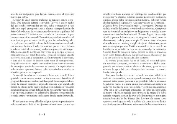 A pesar de aquel intenso malestar , de repente , sonrió orgulloso . Una rotunda certeza le invadió . Tal vez el único hecho del que estaba convencido : por fin , había conseguido el tan anhelado papel protagonista en la última superproducción de Asier Cabredo , uno de los directores de cine más taquilleros del panorama actual . Llevaba meses tratando de convencer al popularmente conocido como el « Tarantino español » de que él era el actor idóneo para su nuevo thriller y , por fin , lo había logrado . La tarde anterior , recibió la llamada del esquivo cineasta , donde con un tono bastante frío le comunicaba que se convertiría en la cabeza visible de su nuevo y ambicioso proyecto . Atrás quedaban semanas de insistencia convertida en principio de acoso para hacerse con el papel de su vida . Tenía que conseguir aquella interpretación , que le catapultaría definitivamente al estrellato , y para ello no dudó en insistir hasta rozar el hostigamiento . Propició encuentros , supuestamente fortuitos y le envió decenas de mensajes a través de contactos en común . Cualquier táctica se le antojaba oportuna . Nunca había actuado de ese modo tan obsesivo , pero no se arrepentía .