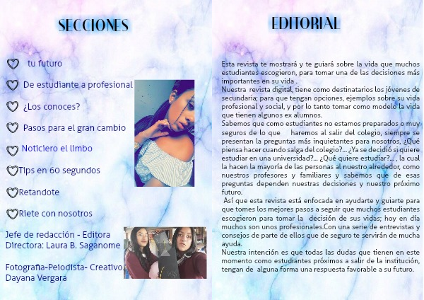 Así que esta revista está enfocada en ayudarte y guiarte para que tomes los mejores pasos a seguir que muchos estudiantes escogieron para tomar la decisión de sus vidas; hoy en día muchos son unos profesionales.Con una serie de entrevistas y consejos de parte de ellos que de seguro te servirán de mucha ayuda.