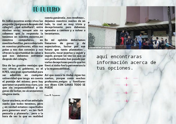 En todos nosotros están vivas las pregunta ¿qué pasará después del colegio?, ¿qué estudiaré?, entre muchas otras; aunque aún no sabemos que la respuesta la tenemos en nuestro entorno,en nuestros compañeros, en nuestras familias, pero sobre todo en nuestros profesores, ellos nos guían y nos dan consejos y nos ofrecen la oportunidad de saber a qué nos debemos enfrentar después del colegio.