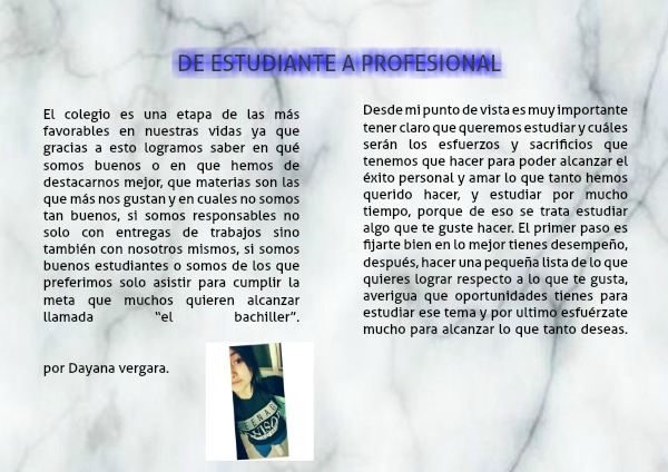 El colegio es una etapa de las más favorables en nuestras vidas ya que gracias a esto logramos saber en qué somos buenos o en que hemos de destacarnos mejor, que materias son las que más nos gustan y en cuales no somos tan buenos, si somos responsables no solo con entregas de trabajos sino también con nosotros mismos, si somos buenos estudiantes o somos de los que preferimos solo asistir para cumplir la meta que muchos quieren alcanzar llamada “el bachiller”.