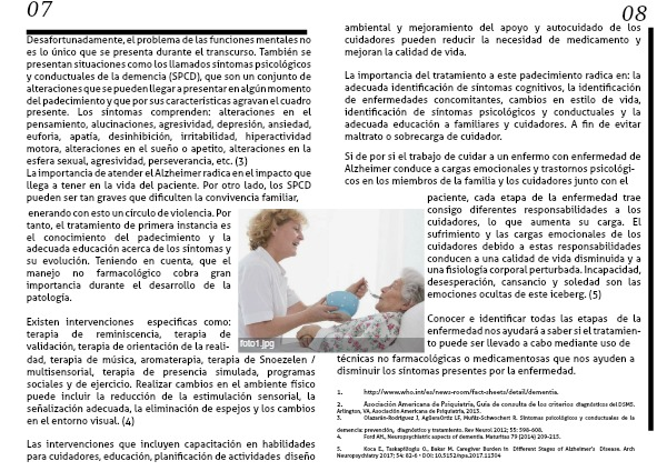 Desafortunadamente, el problema de las funciones mentales no es lo único que se presenta durante el transcurso. También se presentan situaciones como los llamados síntomas psicológicos y conductuales de la demencia (SPCD), que son un conjunto de alteraciones que se pueden llegar a presentar en algún momento del padecimiento y que por sus características agravan el cuadro presente. Los síntomas comprenden: alteraciones en el pensamiento, alucinaciones, agresividad, depresión, ansiedad, euforia, apatía, desinhibición, irritabilidad, hiperactividad motora, alteraciones en el sueño o apetito, alteraciones en la esfera sexual, agresividad, perseverancia, etc. (3)
