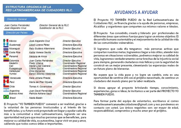 El Proyecto YO TAMBIÉN PUEDO de la Red Latinoamericana de Cuidadores RLC, se financia gracias a la ayuda de personas, empresas, Alcaldías y organismos que comparten sus mismos valores e ideales.