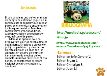 El oso panda es uno de los animales en peligro de extinción y que en su comida esta el bambú y que quedan pocos en el mundo, se encuentra en los bosques de china. Tambien comen yerva ,gencianas, lirios, azafrán y también de roedores y aves, así como de peces.
