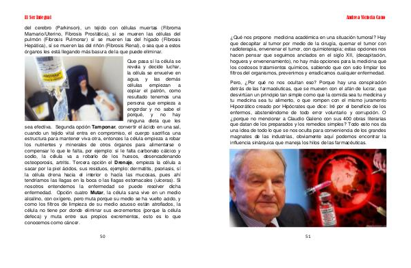 Que pasa sí la célula se revela y decide luchar, la célula se envuelve en agua, y las demás células empiezan a copiar el patrón, como resultado tenemos una persona que empieza a engordar y no sabe el porqué, y no hay ninguna dieta que les sea efectiva. Segunda opción Tamponar, convertir el ácido en una sal, cuando un tejido vital entra en compromiso, el cuerpo sacrifica una estructura para mantener viva otra, entonces la célula empieza a robar los nutrientes y minerales de otros órganos para alimentarse o compensar lo que le falta, por ejemplo: sí le falta carbonato cálcico y sodio, la célula va a robarlo de los huesos, desencadenando osteoporosis, artritis. Tercera opción el Drenaje, empieza la célula a sacar por la piel ácidos, sus residuos, ejemplo: dermatitis, psoriasis, sí la célula drena hacia el interior o hacía las mucosas, pues ahí tendríamos las llagas en la boca o las llagas estomacales( ulceras). Si nosotros entendemos la enfermedad se puede resolver dicha enfermedad. Opción cuatro Mutar, la célula sana vive en un medio alcalino, con oxígeno, pero muta porque su medio se ha vuelto acido, y como los filtros de limpieza de su medio acuoso están atrofiados, la célula no tiene por donde eliminar sus excrementos( porque la célula defeca) y muta entre sus propios excrementos, esto es lo que conocemos como cáncer.