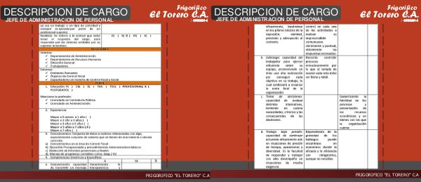 DESCRIPCION DE CARGO JEFE DE ADMINISTRACION DE PERSONAL 20 Frigorifico El Torero J- C.A. 00102231-4 FRIGORIFICO “EL TORERO” C.A