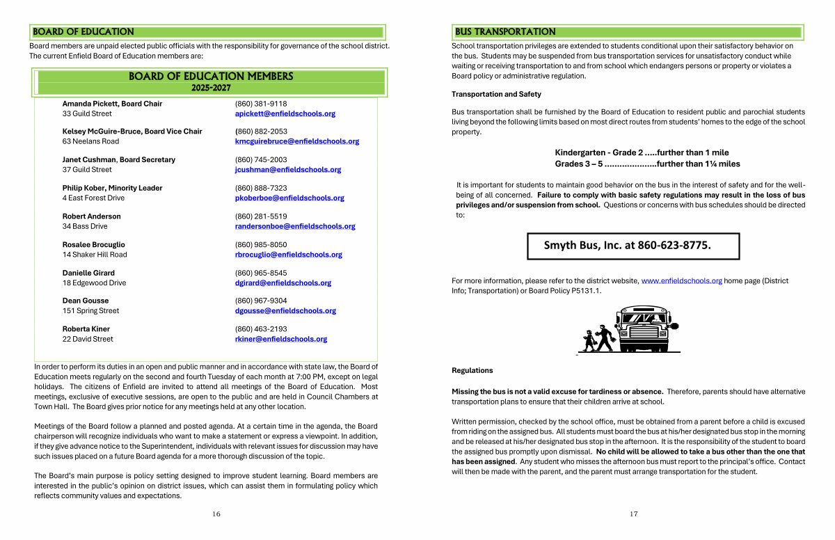 For more information, please refer to the district website, www. enfieldschools. org home page( District Info; Transportation) or Board Policy P5131.1.