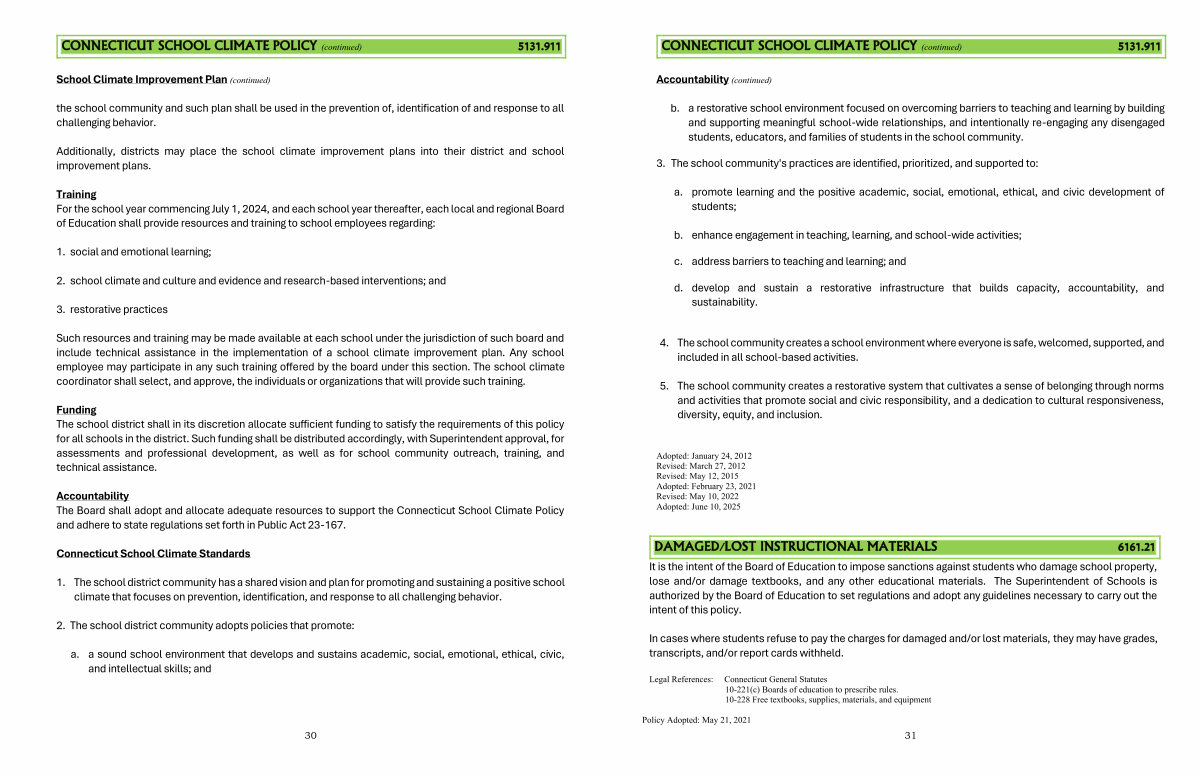 CONNECTICUT SCHOOL CLIMATE POLICY( continued) 5131.911