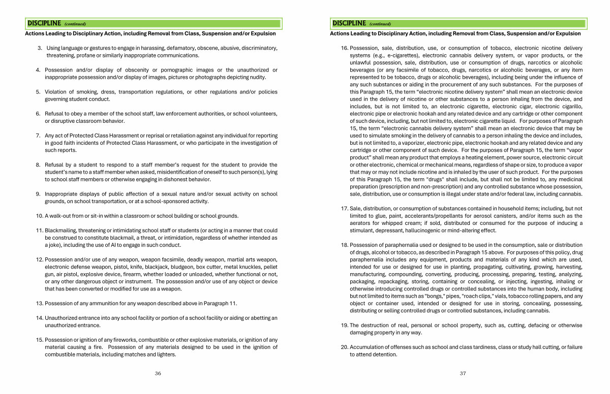 Actions Leading to Disciplinary Action, including Removal from Class, Suspension and / or Expulsion