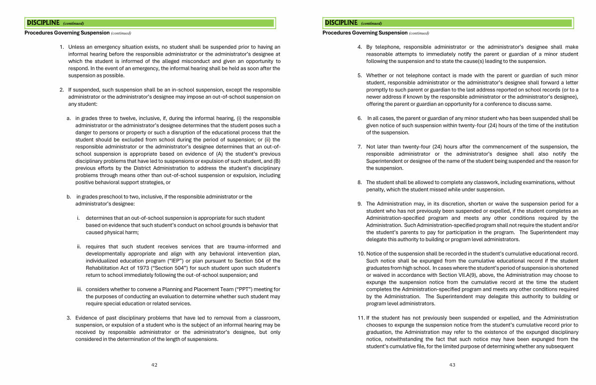 9. The Administration may, in its discretion, shorten or waive the suspension period for a student who has not previously been suspended or expelled, if the student completes an Administration-specified program and meets any other conditions required by the Administration. Such Administration-specified program shall not require the student and / or the student’ s parents to pay for participation in the program. The Superintendent may delegate this authority to building or program level administrators.