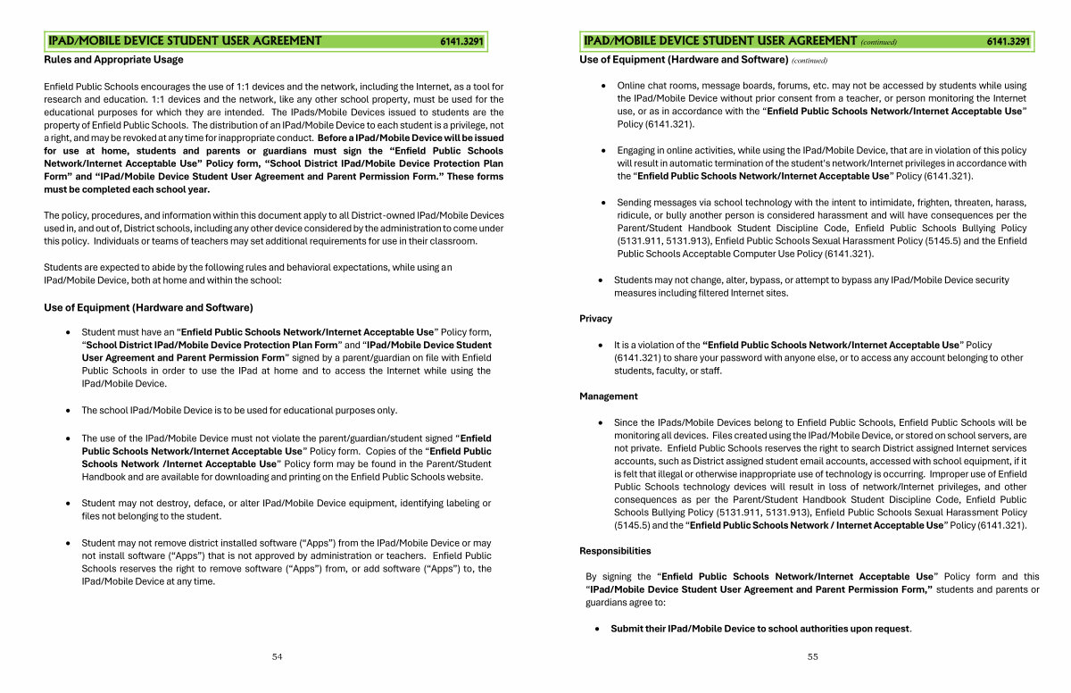 • The use of the IPad / Mobile Device must not violate the parent / guardian / student signed“ Enfield Public Schools Network / Internet Acceptable Use” Policy form. Copies of the“ Enfield Public Schools Network / Internet Acceptable Use” Policy form may be found in the Parent / Student Handbook and are available for downloading and printing on the Enfield Public Schools website.